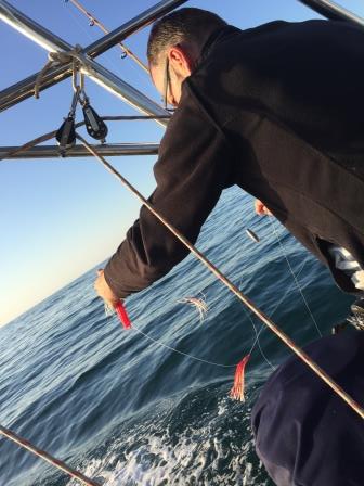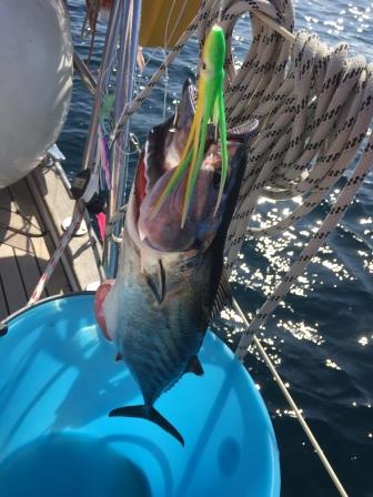 Nachdem mein lieber Mann, bezüglich Angelausrüstung in Cadiz am Vorabend noch schnell nachgerüstet hat, sind auch schnell, nach 2,5 Stunden motoren, die Segel und auch die Angel draußen. Dieses mal mit neuem Köder…..und siehe da, kurze Zeit später auch schon der erste Biss. Nur die neue Spule hält nicht was sie verspricht und so holen wir den Thunfisch, welcher groß genug für uns beide ist, mit dem guten alten Holzbrett aus dem Wasser.