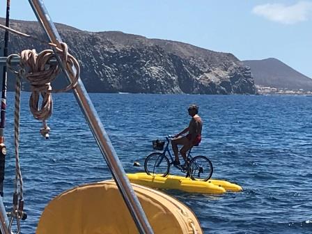 Da es uns wieder mal nach einer Bucht lüstet, werfen wir den Anker vor dem Strand in Los Christianos. Es ist zwar eine schaukelige Angelegenheit, aber es geht nichts über einen morgendlichen Sprung ins 25°C warme (kühle) Wasser.