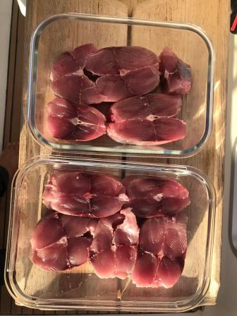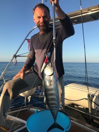 Heute ist wieder mal Zeit zum Angeln, der Köder wird ausgeworfen und eine Stunde später hängt auch schon ein richtig schöner Bonita am Haken. Dieser wird dann fachmännisch zerteilt und in die Kühlung verfrachtet.