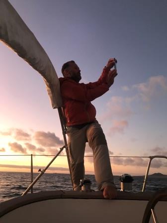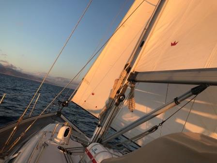 Den Motor können wir dann um 12:40 abstellen, bis dahin dient uns Genua und Großsegel klein als Stabilisation, da der Wind genau von vorne kommt. Danach segeln wir mit vollem Zeug und Wind aus NE im Schnitt fünf Knoten in den Sonnenuntergang und sind fasziniert von den Farben der Landschaft. Es ist schon dunkel als wir vor dem Hafen Morro Jable um 21:30 und 75 Seemeilen, den Anker ins Schwarze etwas fallen lassen.