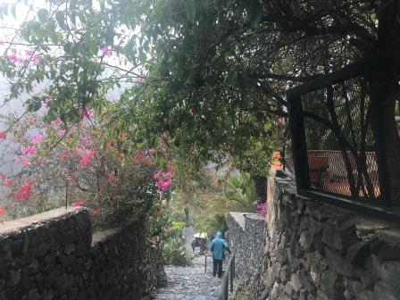 ist ein Bergdorf im Nordwesten der Insel und nur über eine schmale Straße erreichbar. Wir schlängeln hinter einem Bus nach und fragen uns, warum dass hier überhaupt erlaubt ist. Der Busfahrer muss in jeder Kurve einmal zurücksetzen, damit er überhaupt rumkommt. Endlich angekommen, spazieren wir im Regen über die aalglatten Pflastersteine in das kleine Dörfchen. Bei Kaffee und Schokotorte bestaunen wir diese bizarre Landschaft.