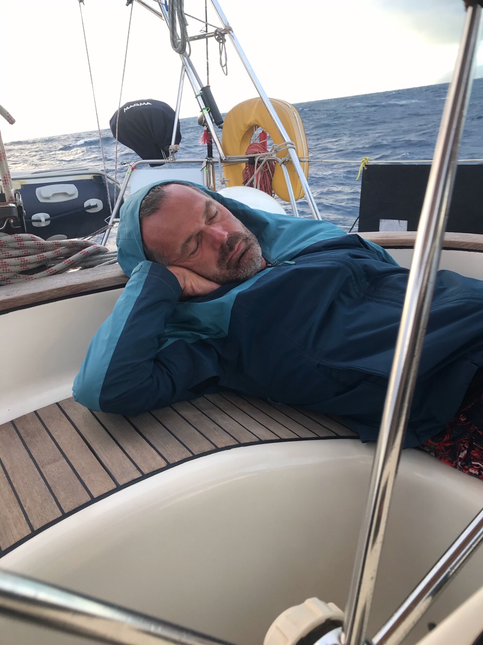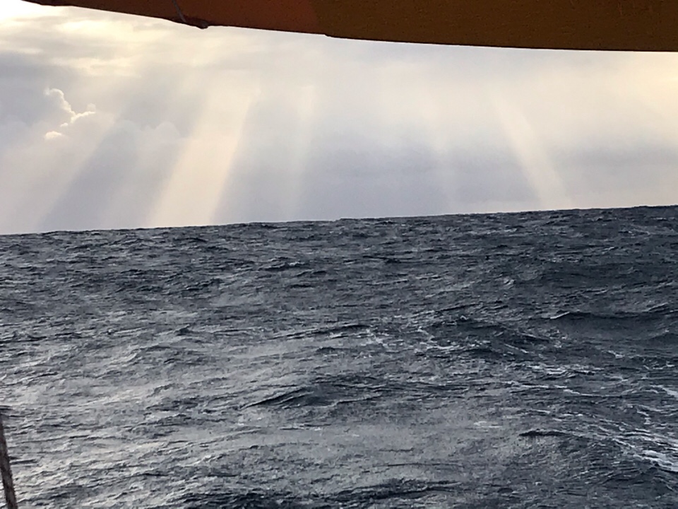 Um 16:30 beginnen wir dann endlich unsere Fahrt, der Anfang gestaltet sich ein wenig schwierig, gegen Welle (bis 2 m) und Wind gegenan. Wir setzen das Großsegel, um ruhiger in der Welle zu fahren, später auch die Genua um dann zwei Stunden später den Motor abzustellen und im Wind zu segeln. Dieser raumt immer mehr und so bergen wir um 22:00 das Groß und segeln mit 4,5 Speed durch die Nacht. Diese bringt immer wieder Regenschauer, wir wechseln uns im 3 Stunden Rhythmus ab.