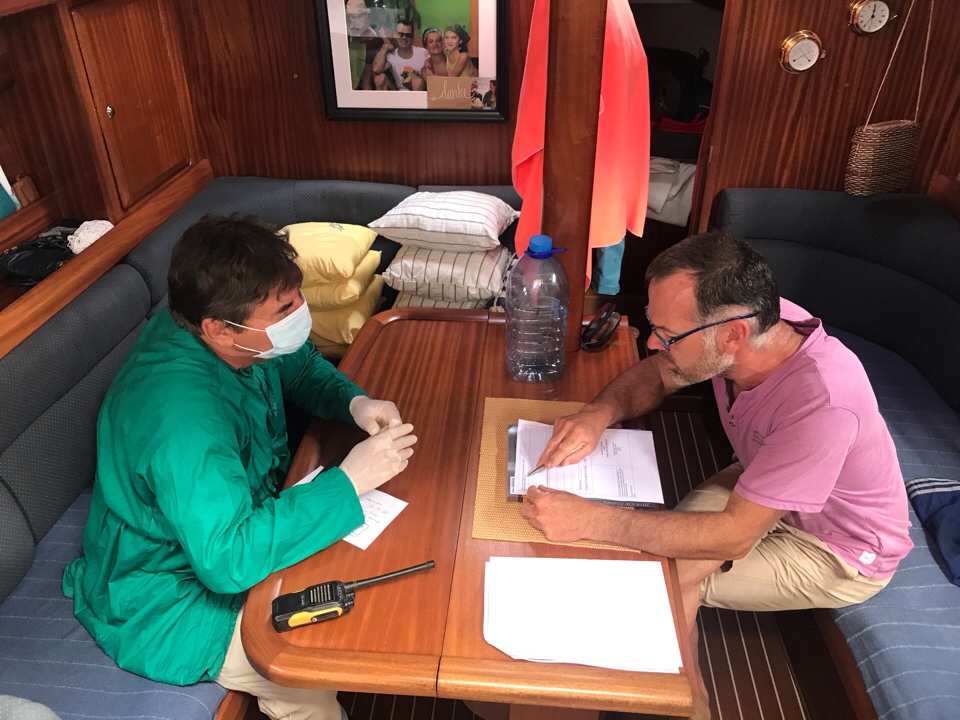 Um 09:00 wird, wie angekündigt, Dr. Ronaldo, mit Schutzmaske und grünem OP Mantel an Bord gebracht. Er ist sehr entzückend, misst unsere Körpertemperatur mit Infrarotthermometer an der Stirn und wir müssen einiges an Zettelwirtschaft ausfüllen. Danach geht es mit ihm gemeinsam in die Marina, wo wir längsseits festmachen.