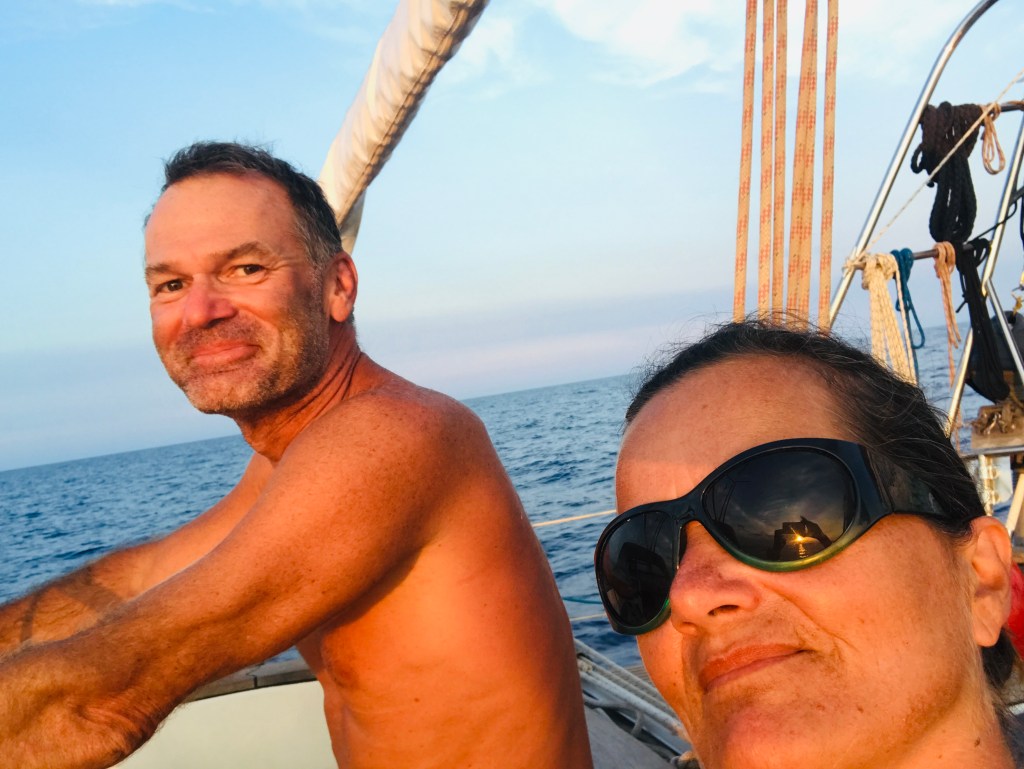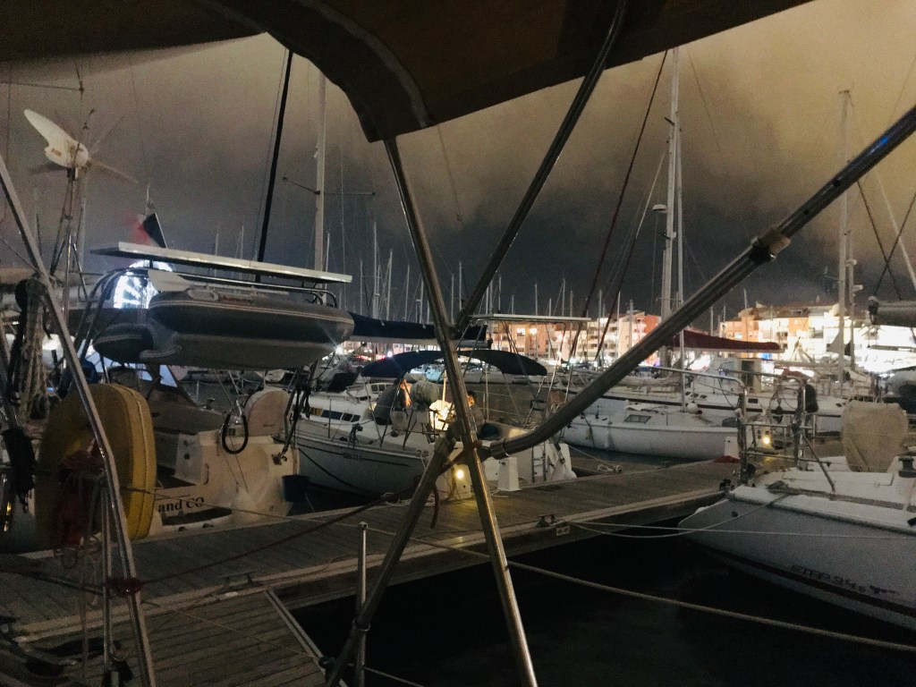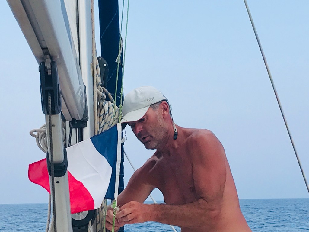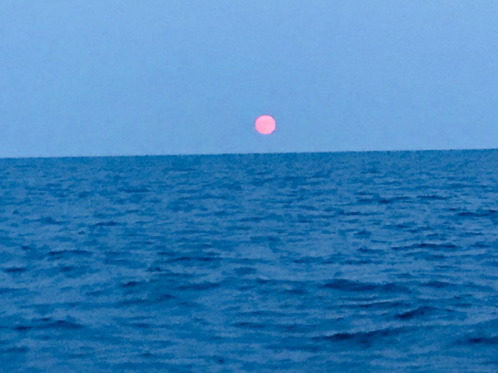 Am Vormittag gehen wir Anker auf in der Cala Addaya. Vorher packen wir noch unseren Überfahrtsrucksack. Wir nehmen Kurs 340 °, setzen Segel und schalten um 13:00 den Motor aus. Abends vor Sonnenuntergang schläft der Wind ein, wir bergen die Segel und fahren unter Motor bis kurz vor Mitternacht. Während der zweiten Nachthälfte schiebt uns unsere Genua immer näher ans Ziel. Durch den Vollmond leuchtet der Sternenhimmel nicht so hell, aber hin und wieder können wir auch Sternschnuppen sehen.