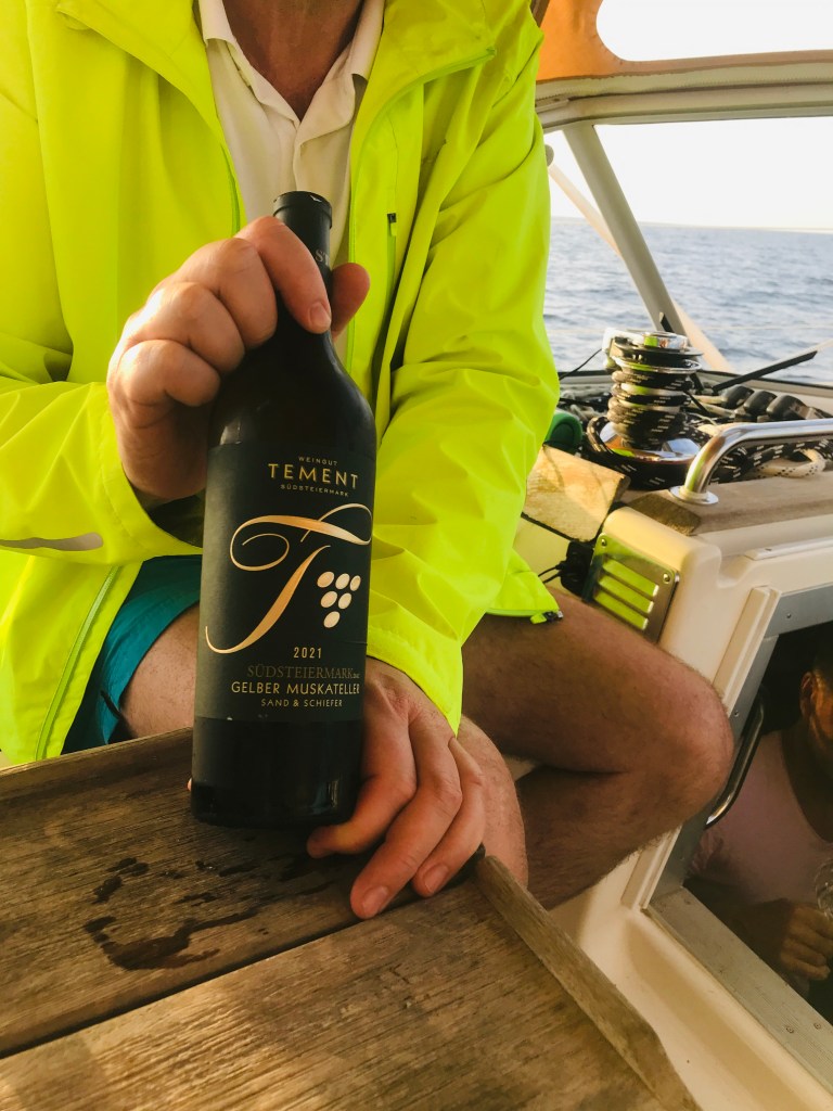 Da wir es nicht bis zum Sonnenuntergang in die Marina Ragusa schaffen werden, wird der Sundowner aus Österreich, eben an Bord genossen.