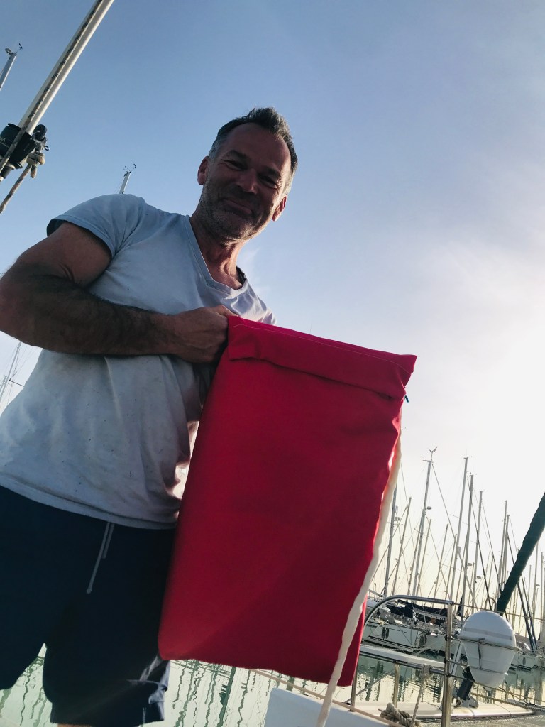 Auch die Tasche unserer Lifesling hat unter den Witterungsverhältnissen der letzten 10 Jahre gelitten. Im Sinne der Nachhaltigkeit, die Rettungsschlinge ist in Ordnung und Kosten von €90,- einer neuen Ersatztasche, wird aus Sunbrellastoff eine neue gezaubert – eccola qui!