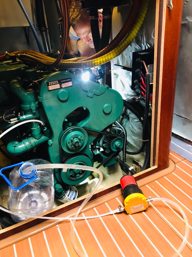 An trüben Tagen wird Indoor gearbeitet. Der Motor wurde vergangene Saison sehr viel beansprucht, heute stehen Öl- und Filterwechsel auf dem Programm.