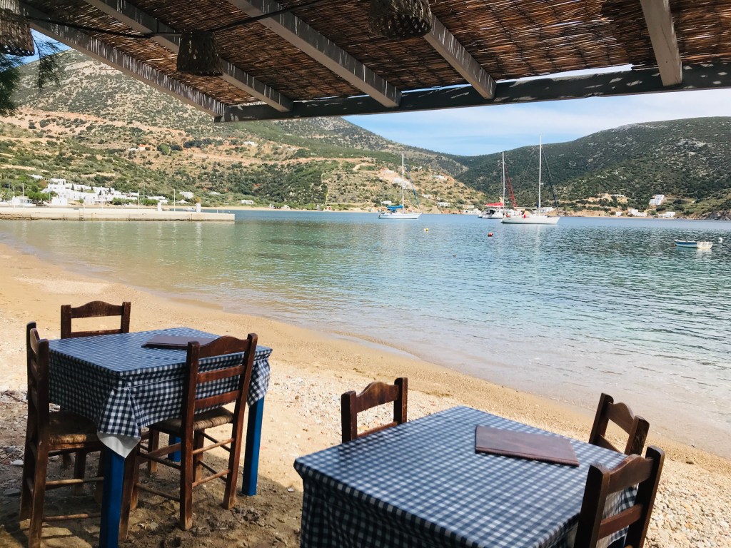 Die gute Seele Georgis vertaut uns, für 25 Euro die Nacht, in einer ruhigen Ecke. Hier ist es schon recht belebt, Fähren kommen und gehen und bringen Rucksacktouristen aus aller Herren Länder. Unsere Footloose sicher im Hafen wissend, erkunden wir die Stadt Chora, schlendern am Strand entlang und genießen ein Glas Prosecco im Strandrestaurant Flisvos.