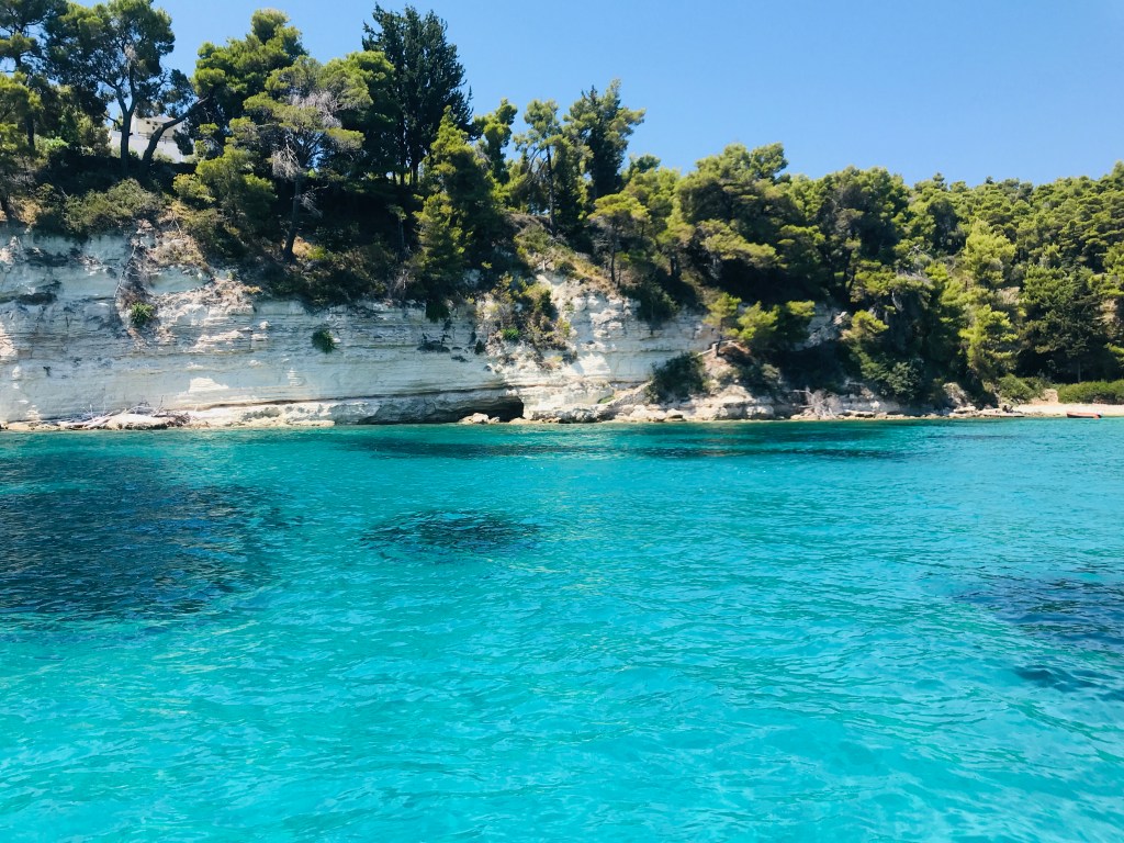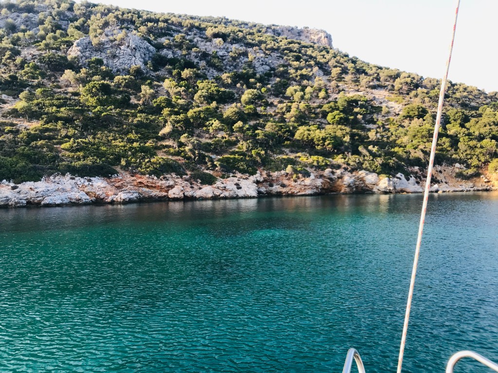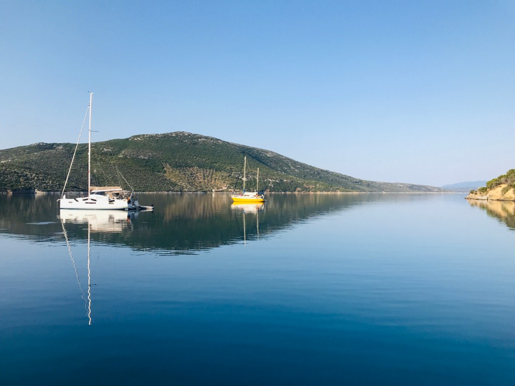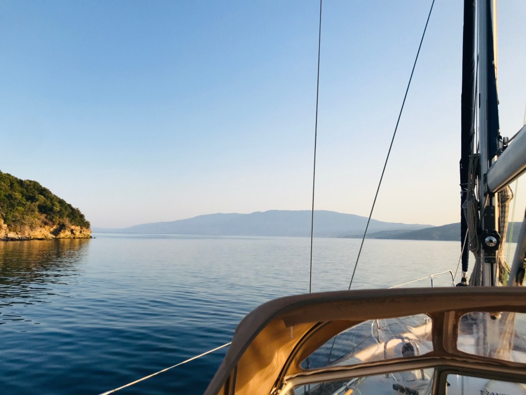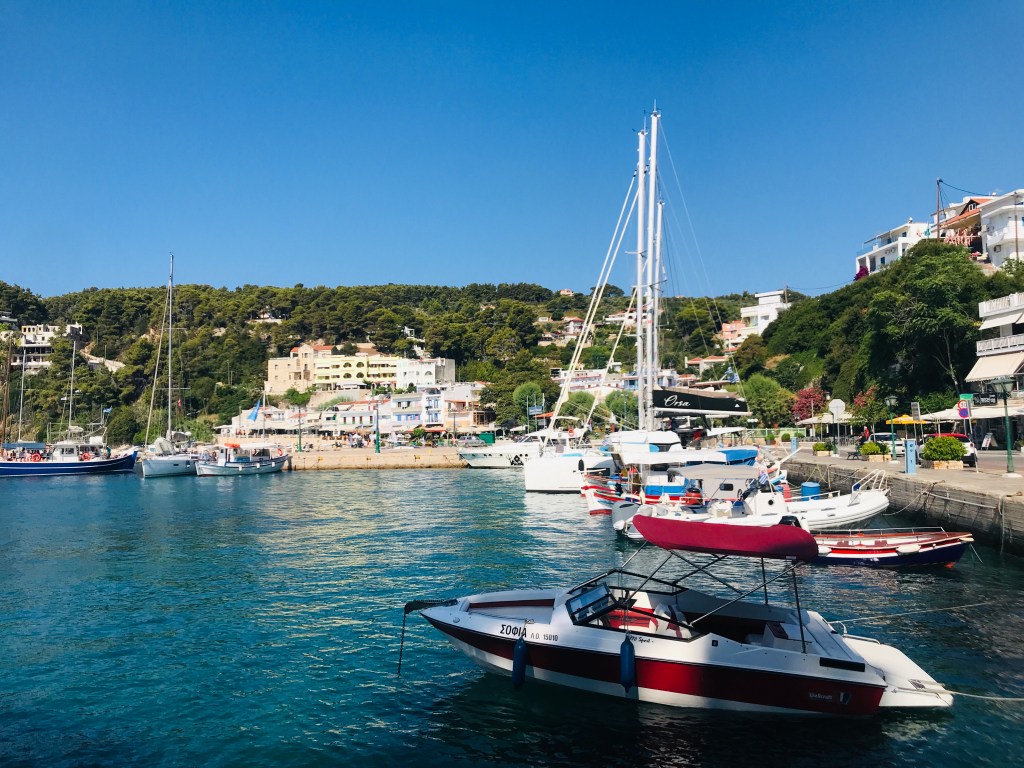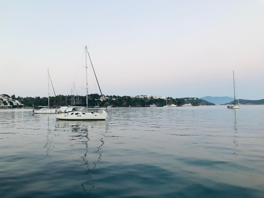 Frühmorgens weckt uns starker Schwell, es geht Anker auf in die geschütztere Skiathos Bay. Es braucht mehrere Ankerversuche, bis wir einen geeigneten Platz gefunden haben. Und wieder bläst uns der Meltemi mit 25 Knoten um die Ohren. Am Abend lässt der Wind nach, sodass wir, unser Schiff für ein paar Stunden alleine lassen können.
