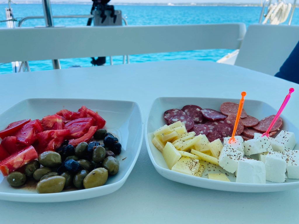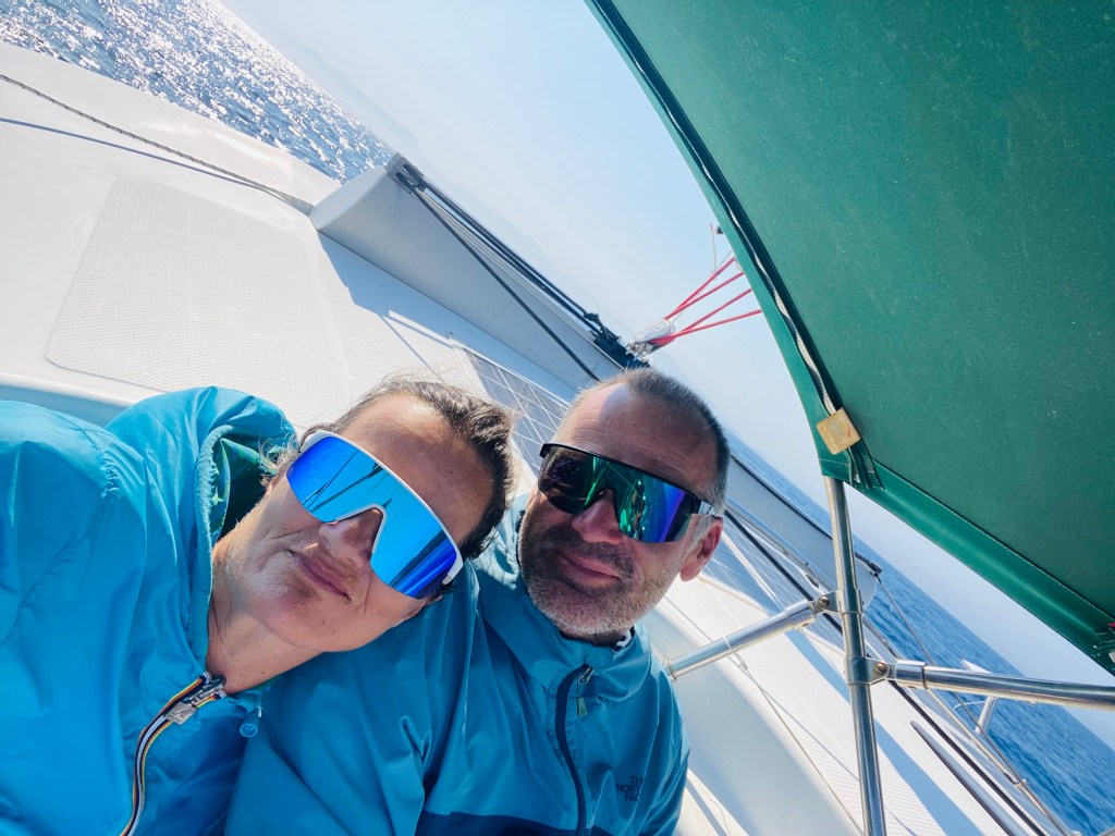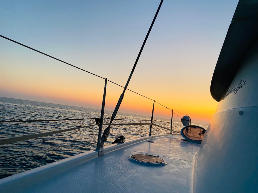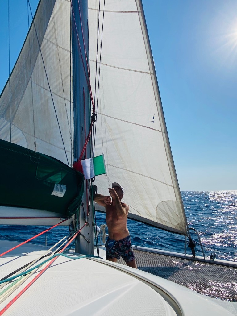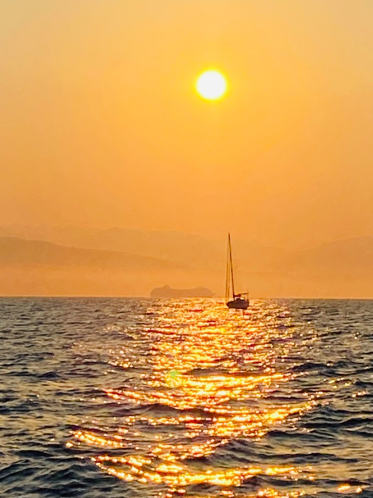 Nach 26 Seemeilen fällt der Anker dann in Ormos Kalami, wo wir zwei Nächte verbringen werden. Da wir zu nah am Strand liegen, ankern wir am Abend, nachdem sich die Bucht geleert hat, weiter vorne. Nach genauer Wetter- und Windrecherche, beschließen wir am Mittwoch den 16.07.2025 die Überfahrt nach Italien zu starten. Die 80 Seemeilen sollten wir an einem Tag schaffen, Wecker wird für 4:30 gestellt. Um 3:30 hören wir plötzlich Stimmen, das Nachbarboot, eine französische Familie, ist uns sehr nahe gekommen. Wir holen Kette, an Schlaf ist jetzt nicht mehr zu denken. Mit einer Tasse Kaffee im Blut, starten wir die Maschinen um 05:00 und fahren unter Motor in die nicht mehr ganz finstere Nacht.