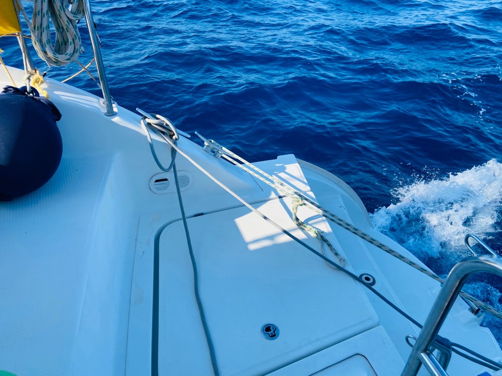 Um 17:00 kracht es plötzlich, wir sitzen beide am Steuerstand und schauen nach Achtern – von der Dingihalterung ist ein Seil gerissen. Sofort werden die Segel geborgen, damit wir langsamer werden. Der neue Außenborder ist noch am Beiboot, die Batterie befindet sich unter Wasser. Wir befestigen das Dingi an einer langen Leine und Markus begibt sich in das Beiboot, um Ersatzleinen zu befestigen. Nach einer halben Stunde haben wir das Dingi wieder hochgezogen und zusätzlich gesichert. Nun können wir wieder Fahrt aufnehmen. Vor ein paar Tagen haben wir noch darüber gesprochen, dass wir die Leinen gegen Ketten austauschen werden.