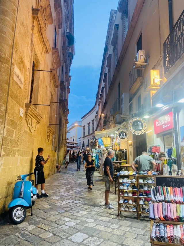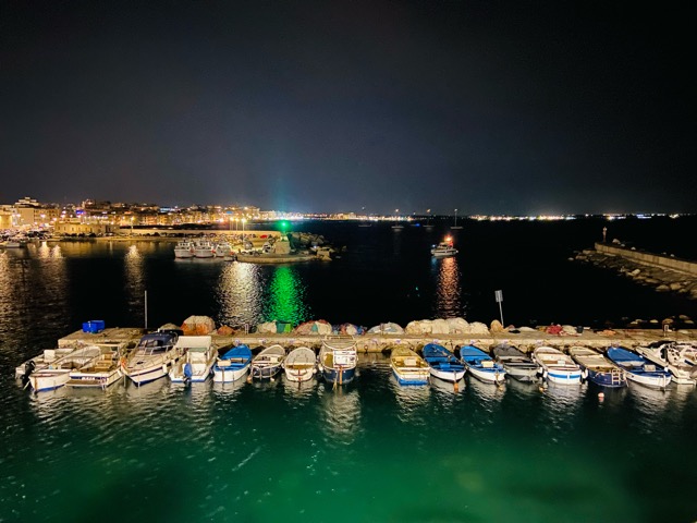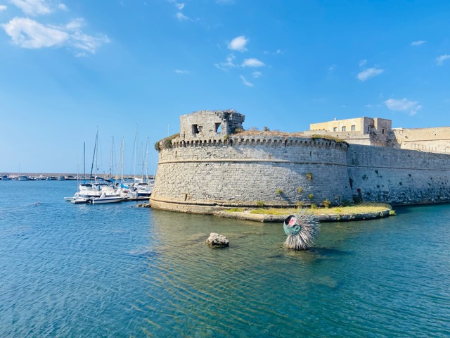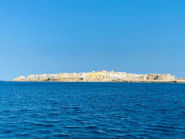 Vor dem Südwestwind liegen wir am Donnerstag gut geschützt in der Bucht Torre del Pizzo. Nach einer späten Jause wechseln wir am Abend dann drei Meilen weiter, vor die Hafeneinfahrt in Gallipoli, da der Wind dann wieder aus Nordwesten kommen soll.