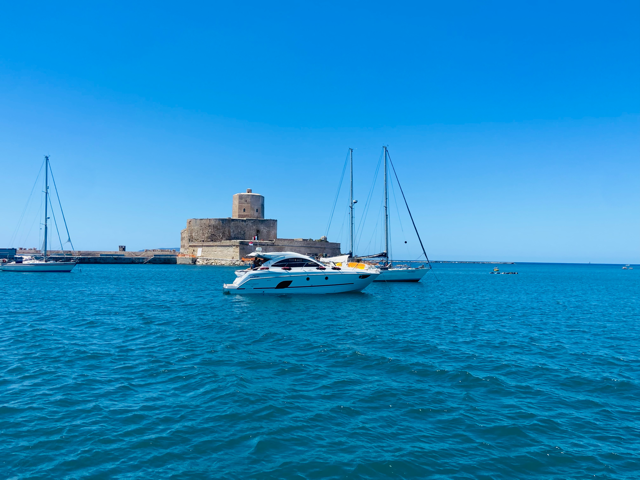 Es geht zurück nach Trapani, mit voller Genua, im raumen Wind und an die 3-4 Knoten Fahrt, wir haben Zeit. Beim Ankommen am Nachmittag ist der Ankerplatz noch leer, wir funken an die Hafenbehörde und sie erlauben uns, wieder für 48 Stunden vor der Burg zu ankern. Neben uns legt etwas später eine wahre Schönheit – Eugenia VII ihren Anker und leistet uns Gesellschaft.