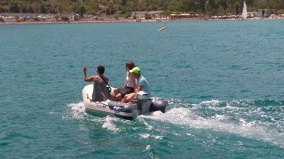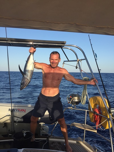 Dienstag 1. August: Die Überfahrt verläuft ruhig, für Markus Geschmack zu ruhig und eher langweilig. Sobald er dies ausgesprochen hat, beginnt die Action. Ein Fisch hat angebissen, „wahrscheinlich nur ein kleiner“!!! Aus dem kleinen Fisch wird dann doch ein stattlicher Thuna mit ca. 20 Kilo. Wir hatten größte Mühe, ihn an Bord zu bringen. Dann die nächste Challenge – das Schaffel, in dem der Fisch ausgenommen werden soll, fällt ins Wasser – bei hohem Wellengang. „Schaffel über Board“- Manöver wird gefahren. Dies dauert allerdings länger als der gesamte Fischfang. Aber wir wollen weder Umweltsünder sein und das Plastik dem Meer überlassen, noch den Fisch ohne ein eigenes Gefäß ausnehmen. So schmeißt sich Markus auf Lisis Kommando ins offene Weltmeer und geht das Risiko eines Heldentodes ein (wegen eines 5 Euro – Schaffels!!!). Danach wird wieder Fahrt aufgenommen und Fisch ausgenommen.