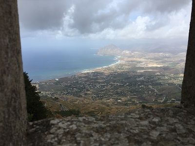 Mittwoch 26. Juli: Zu Mittag begeben wir uns zu Fuß Richtung Seilbahn, welche uns ins Bergdorf Erice auf 751 Meter Seehöhe bringen soll. Leider ist die Bahn wegen Starkwind geschlossen und wir teilen uns mit zwei Italienerinnen ein Taxi. Oben ist es ziemlich frisch und nach einem Besichtigungsrundgang, einem guten Cappucino und einer Mehlspeise gefüllt mit Pistaziencreme, fahren wir dann mit der Seilbahn runter (nach unten geht sie nämlich , nur nicht rauf). Blick auf die Nordküste Richtung Capo San Vito.